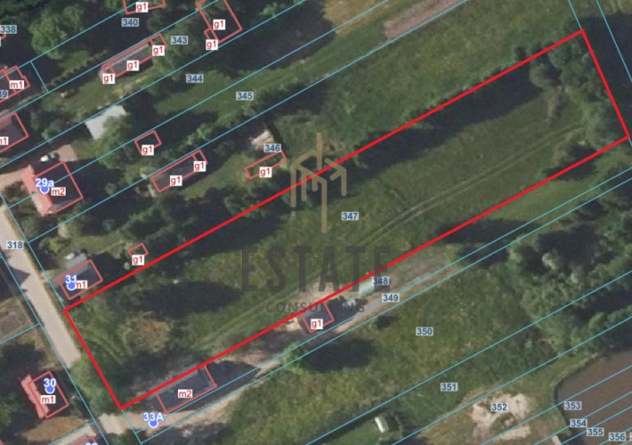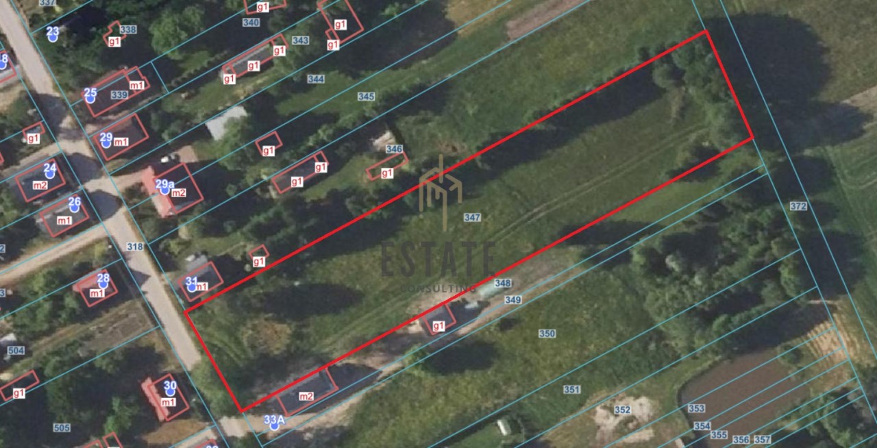Działka o kształcie prostokąta, płaskim ukształtowaniu i przybliżonych wymiarach 31 m x 158 m.